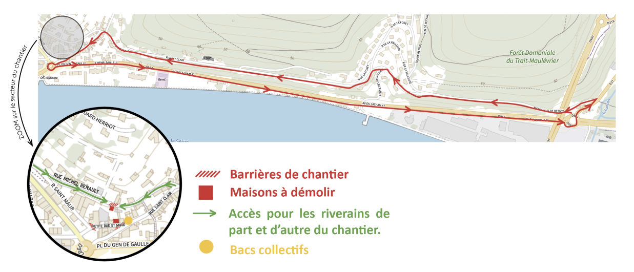 Pendant la durée du chantier, un point de regroupement des ordures ménagères va être mis en place par les services de Caux Seine agglo, avec l’installation de bacs collectifs. Il sera situé au niveau de la rue Saint Clair, à l’angle avec la petite rue Saint Maur.
