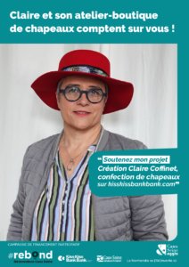 Pour lancer sa boutique, elle fait appel au financement participatif via la campagne #Rebond. Claire Coffinet ambitionne de récolter 3 000€ pour se doter d’outils complémentaires à la création et pouvoir travailler dans de bonnes conditions. Elle souhaite acquérir un cuiseur vapeur professionnel pour chapeaux, une tête marotte, des outils de coupe et outils de mesure.