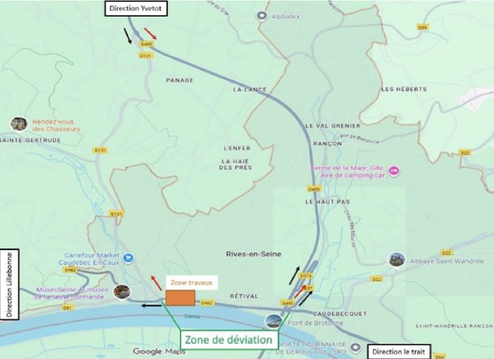 - depuis le giratoire RD 982/RD 37, prendre la direction d’Yvetot, puis la RD 490 en direction de Maulévrier-Sainte-Gertrude / Yvetot, au giratoire de Maulévrier-Sainte-Gertrude prendre la RD 131 en direction de Rives-en-Seine jusqu’au giratoire RD 982/RD 131, selon le plan ci-après :