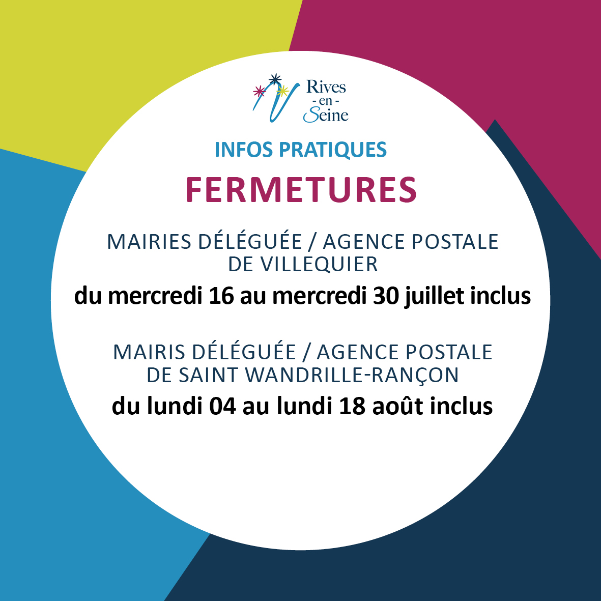 La mairie déléguée et agence postale de Villequier sera fermée du 16 au 30 juillet inclus. La mairie déléguée et agence postale de Saint Wandrille-Rançon sera fermée du 04 au 18 août inclus.