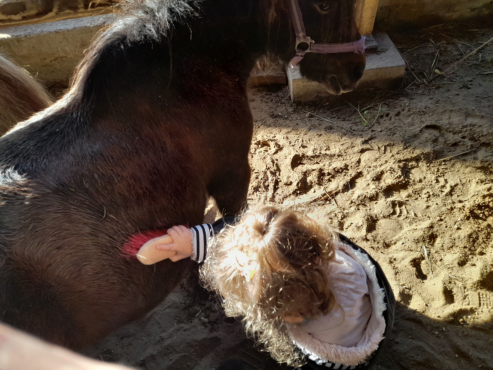 Le mardi 8 octobre 2024, les enfants participant aux ateliers du RPE et accompagnés de leur assistante maternelle, ont découvert un nouvel environnement sécurisant. Ils ont interagi les uns avec les autres pour prendre soin d’un poney, le brosser, le caresser. Certains d’entre eux étaient impressionnés au début de la séance, mais très vite les poneys, eux-mêmes rassurés par la douceur des petits, les ont apaisés. Sous un soleil radieux, tous ont profité des bienfaits de cet animal.