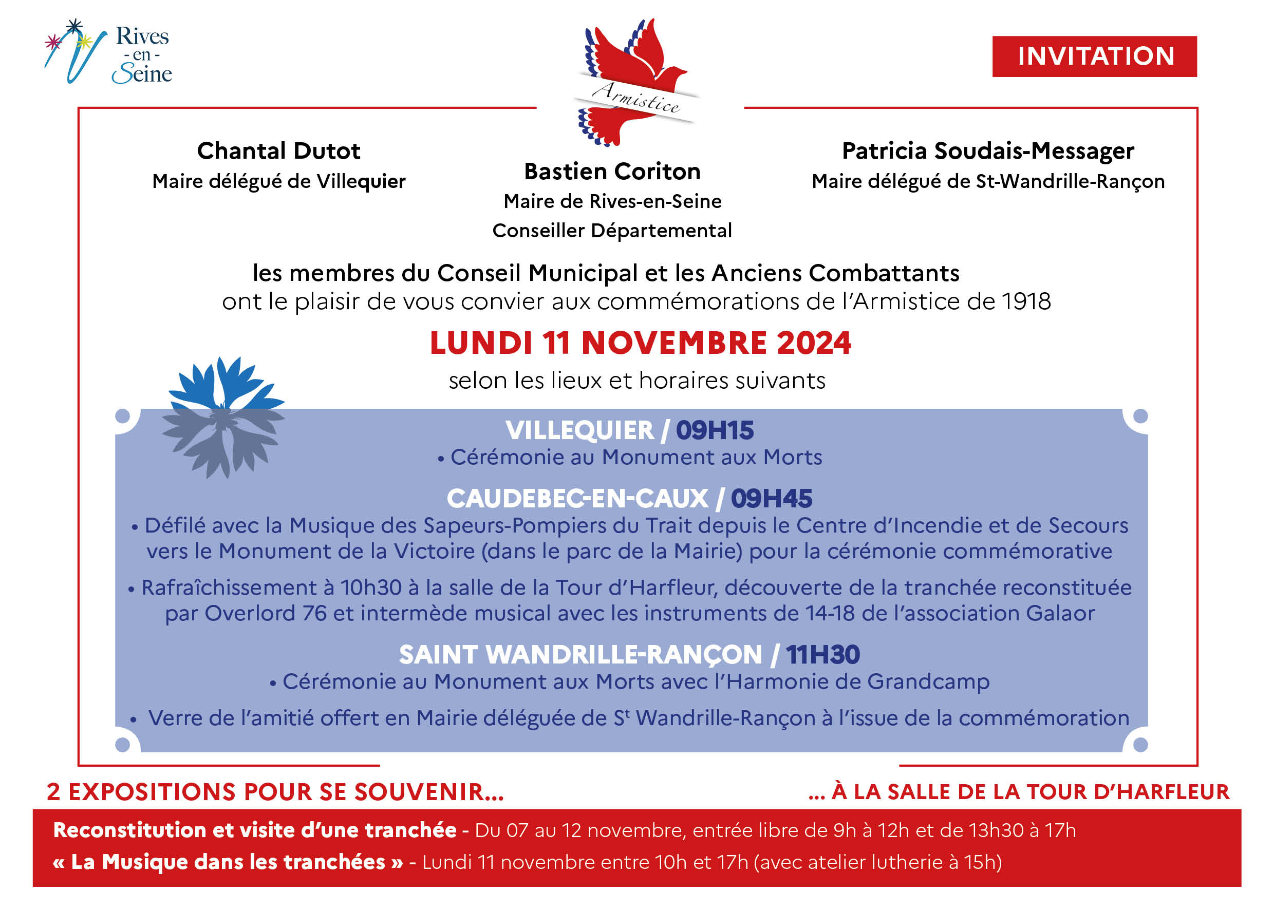 La municipalité de Rives-en-Seine invite tous les habitants à venir rendre hommage aux soldats morts pour la France pendant la 1ère guerre mondiale à l’occasion de la cérémonie commémorative de l’Armistice de 1918.