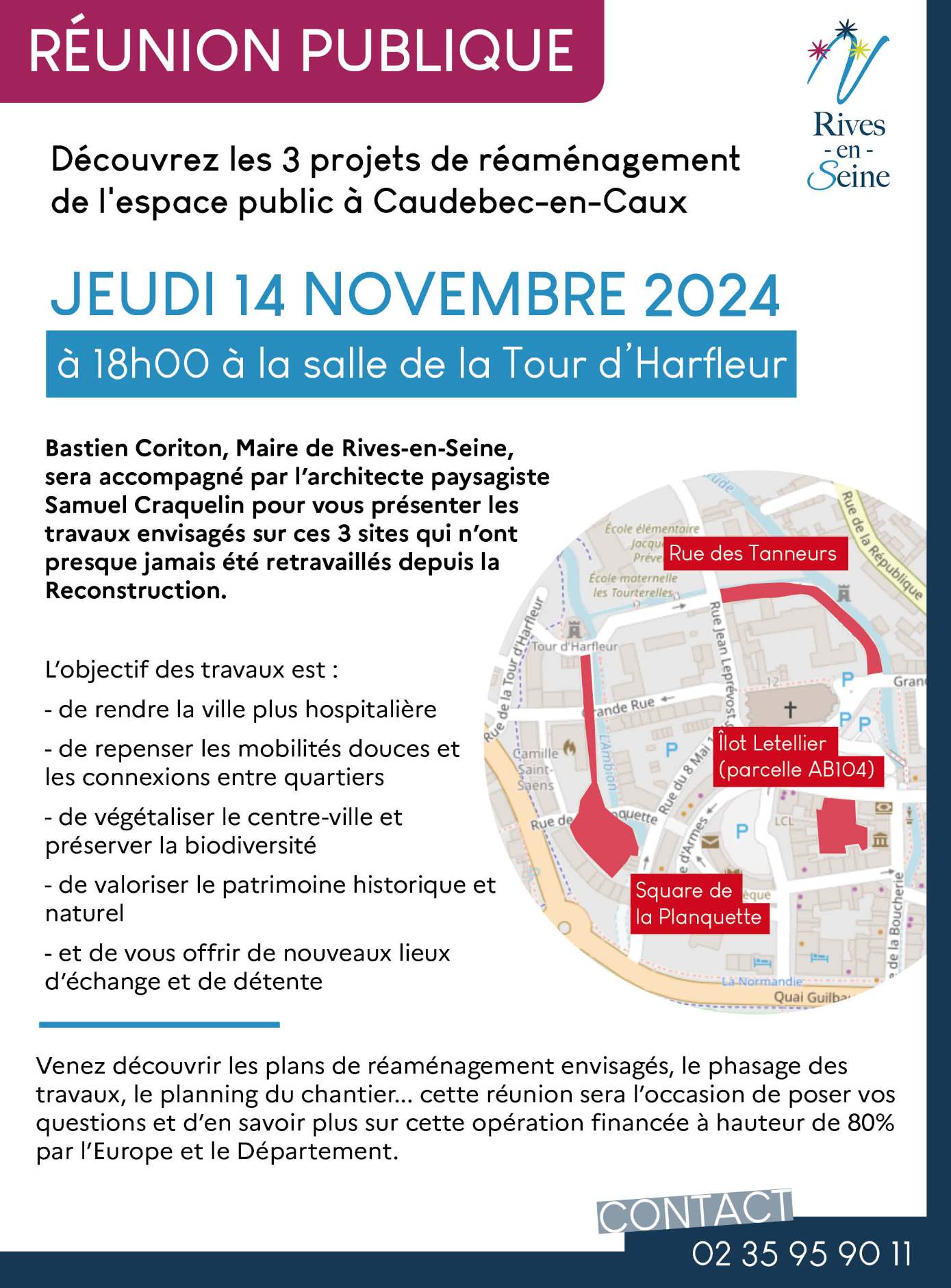 Bastien Coriton, Maire de Rives-en-Seine, sera accompagné par l’architecte paysagiste Samuel Craquelin pour vous présenter les travaux envisagés sur ces 3 sites qui n’ont presque jamais été retravaillés depuis la Reconstruction.