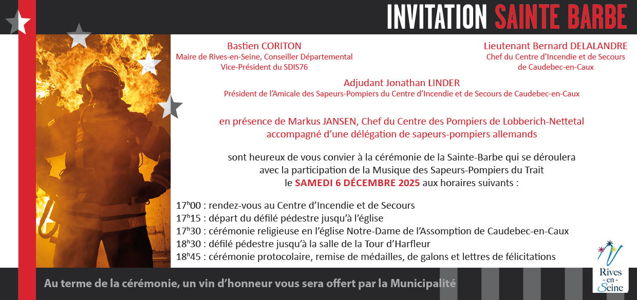 Samedi 6 décembre aura lieu la cérémonie de la Sainte-Barbe (sainte réputée protectrice des sapeurs-pompiers) à laquelle tous les habitants de Rives-en-Seine sont conviés.