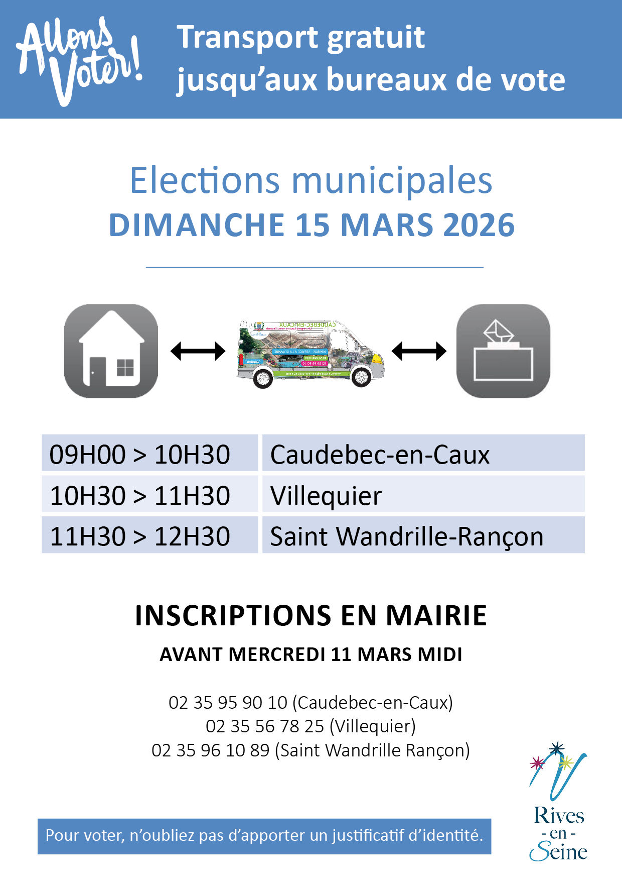 A l’occasion des élections municipales, les 15 et 22 mars prochains, le mini-bus communal de Rives-en-Seine sera mis à la disposition des habitants ne disposant pas de moyen de locomotion :